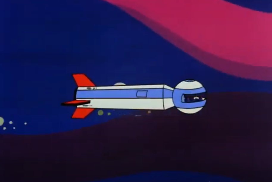 The episode begins with the band, of course, flying through space in their oddly-designed rocket ship...