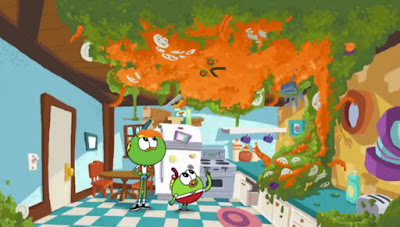 With the frog licking the dishes clean, Buhdeuce and Sway-Sway are free to not to the dishes and go back to playing their game. Too bad the mold that's covering the dishes has become sentient and winds up consuming the frog.